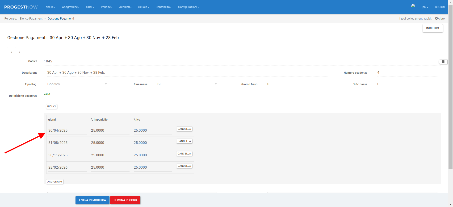 progestNow permette di definire dei codici di pagamento con date fisse