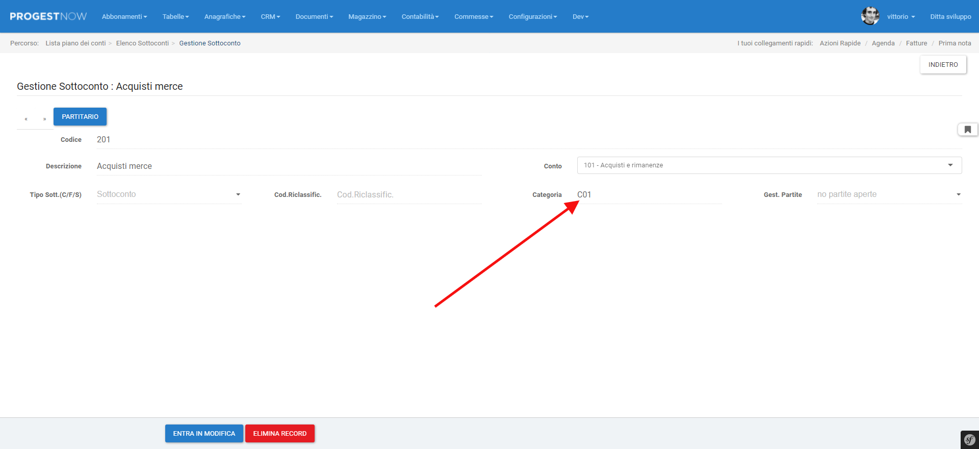 Per assegnare un centro di ricavo specifico ad un sottoconto contabile, entriamo nella scheda del sottoconto. Qui, aggiorniamo il campo categoria, seguendo la convenzione seguente: