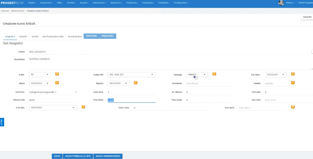 Ora che abbiamo definito il nostro imballo (“SCATOLA 20×30”), possiamo andare nella scheda del nostro articolo e comunicare a ProgestNOW che vogliamo che per tale articolo venga utilizzato (come standard) tale imballo. Impostando che, in tale imballo, potranno essere posizionati 10 pezzi di prodotto.