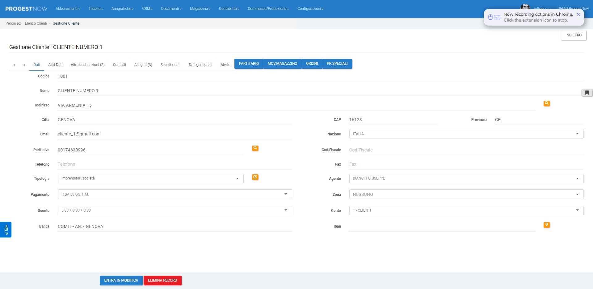 Supponiamo di volere creare una nuova Attività su un cliente specifico. Entriamo nella sua scheda, ed apriamo il menu laterale delle azioni.