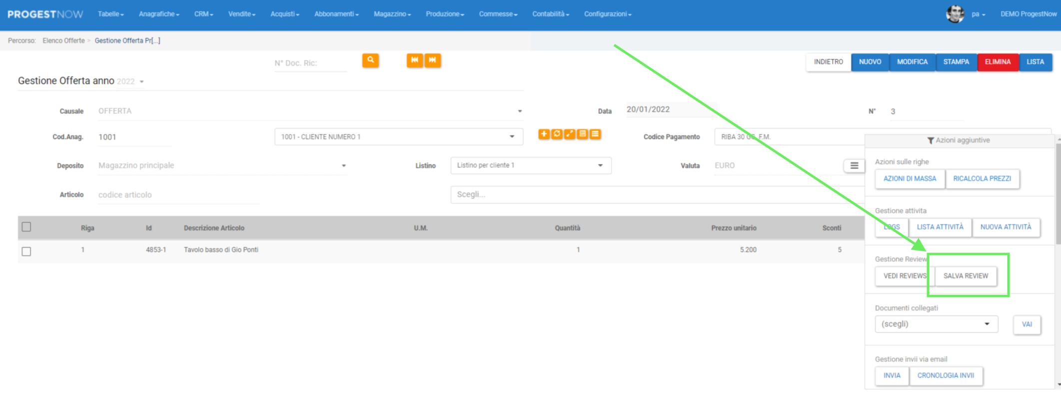 All’interno della pagina di dettaglio dell’Offerta, mediante il bottoncino delle Azioni Aggiuntive di destra, troviamo il bottone “SALVA REVIEW”.