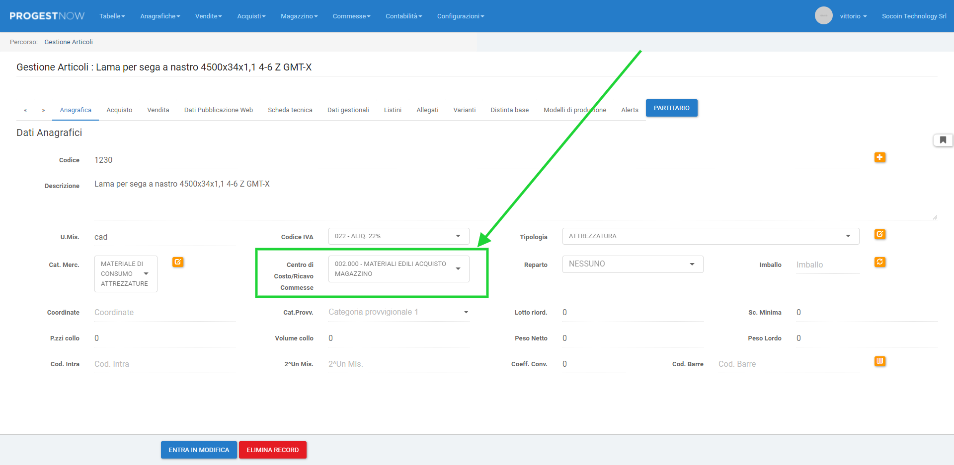 Come prima cosa nella scheda di ogni articolo dobbiamo indicare a quale Centro di Costo/Ricavo fa riferimento: