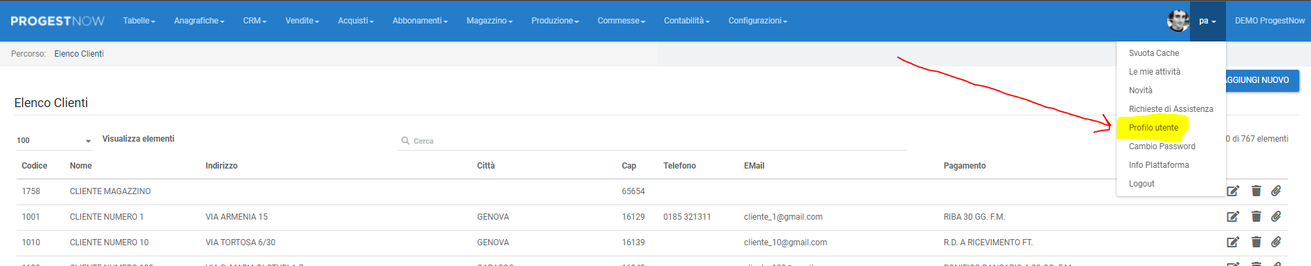 Ciascun operatore può avere preferenze differenti in merito al numero di record visualizzabili quando si entra in una pagina di elenco. Per questo motivo, ProgestNOW permette ad ogni utente di scegliere quanti record visualizzare. Per impostare tale settaggio, andiamo nel nostro Profilo Utente: